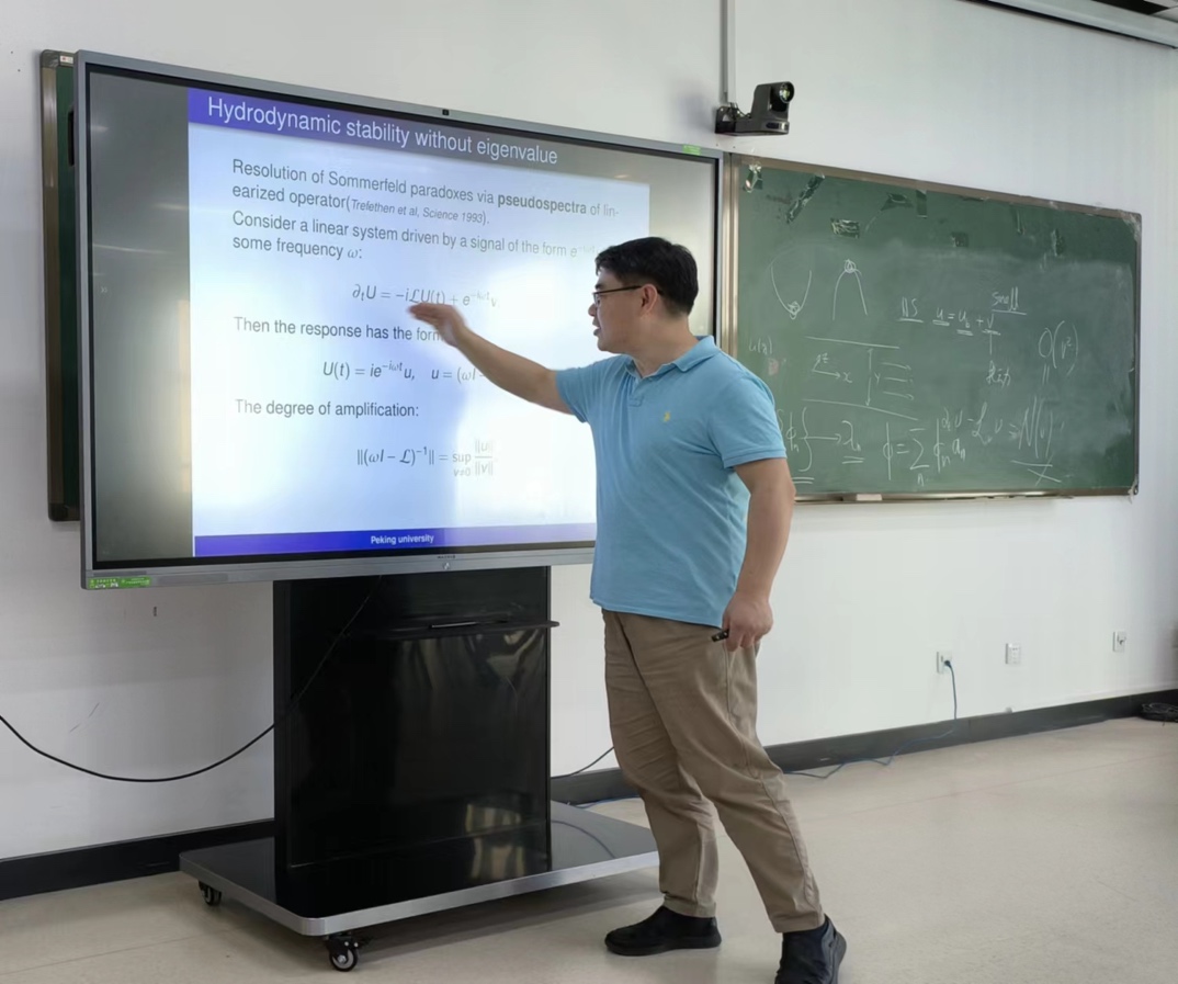 本次报告中,章老师首先介绍了索末菲悖论的历史起源。一百多年前,奥尔和索末菲设计了一种方法,根据流体动力学稳定性理论来解释从层流到湍流的转变。一方面,一些层流(例如平面库埃特流和管道泊肃叶流)对于任何雷诺数都是线性稳定的。另一方面,这些流动可能会变得不稳定,并在高雷诺数下因小而有限的扰动而转变为湍流。这种现象就是著名的索末菲悖论。之后章老师进一步介绍了其流体动力学稳定性理论的早期发展,以及索末菲悖论解决的最新进展,特别是其与合作者近期所取得的重要结果,该结果被国际同行评为该领域里程碑式的重大突破。最后一部分,章老师介绍了一些尚未解决的公开问题,鼓励年轻人勇于探索,多做原创性的工作。报告内容非常丰富,层次分明,讲解特别生动形象,深入浅出。参会老师就报告内容进行了热烈的讨论交流。
