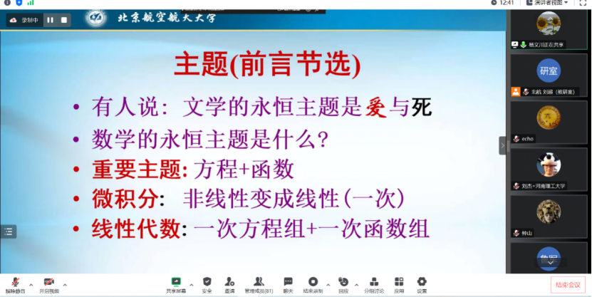 2023年5月17日下午,教育部“面向人文社科学生的大学数学课程群虚拟教研室(中国人民大学牵头)”邀请了国家级教学名师、北京航空航天新葡萄8883官网amg官网李尚志教授作了“线性代数启蒙”的讲座。该讲座由作为虚拟教研室主要成员单位的新葡萄8883官网amg官网组织,通过虚拟教研室面向虚拟教研室全体成员以及有关高校教师直播。教育部“面向人文社科学生的大学数学课程群虚拟教研室”牵头人中国人民大学龙永红教授、吉林大学张然教授以及来自国内多所兄弟院校的80余位师生参加了学习交流。讲座伊始,中国人民大学数学学院黄志勇副院长做了热情洋溢的开场主持。