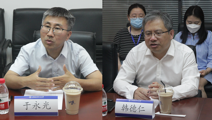韩德仁院长和于永光院长分别介绍了两校数学学院的基本情况,马声明副院长介绍北航数学学院人才培养情况。双方就学科建设定位、规划和发展,教师队伍建设和人才引进,本研学生人才培养体系建设、学生培养成果,思想政治教育及文化建设的主要做法和特色等方面进行了深入交流和探讨。
