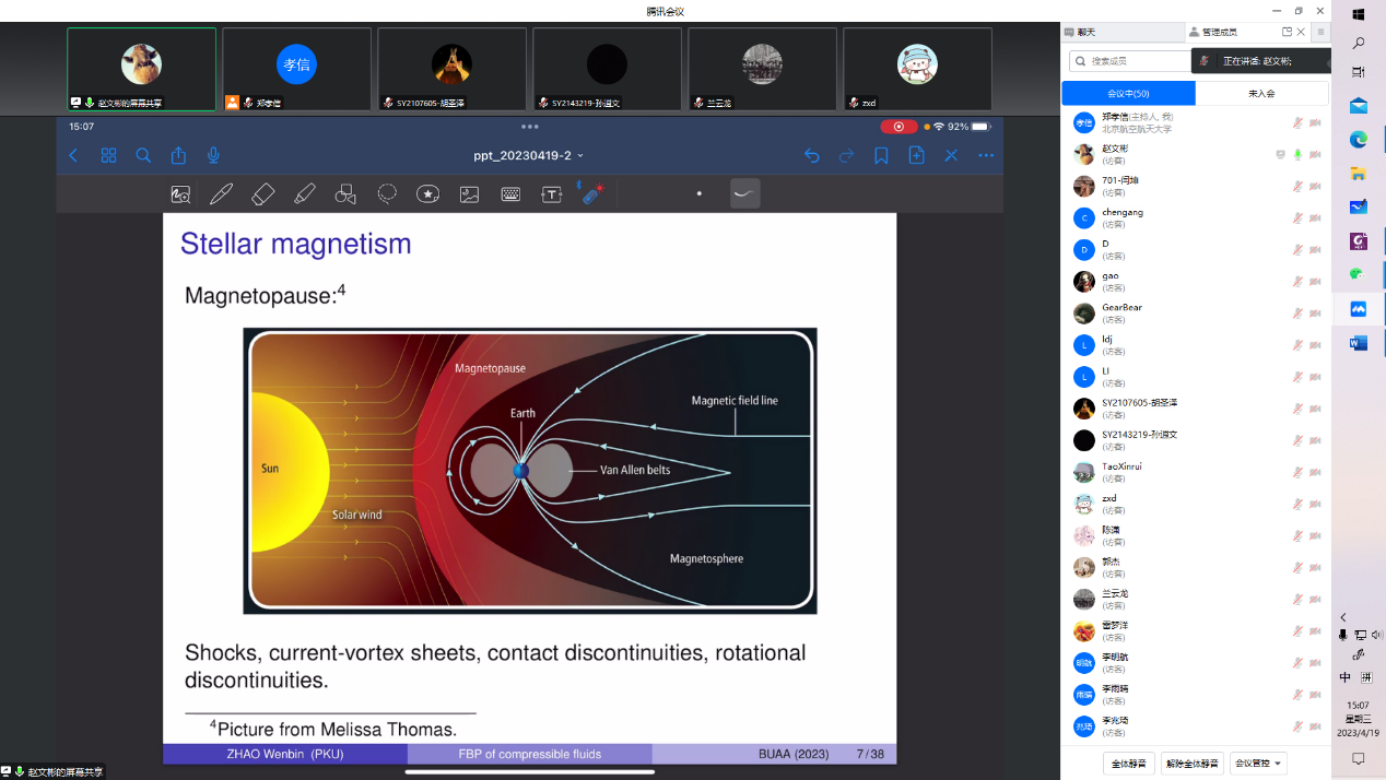 报告过程中,赵文彬博士首先介绍了自由边值问题的背景和研究现状。接下来,他详细介绍了一些常用的分析技巧和研究方法。最后,赵文彬博士阐述了其和合作者最新成果:在泰勒符号条件下,通过演化方程的双曲性首先确定了自由边值问题的稳定性条件,并在此基础上证明了该问题解的适定性和解决了不可压缩极限问题。