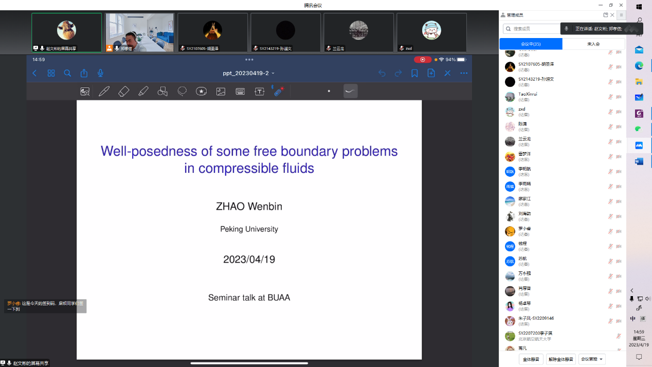 2023年4月19日下午,北京大学赵文彬博士应邀为我院师生带来了一场题为 “Well-posedness of some free boundary problems in compressible fluids”的线上学术报告。报告由郑孝信老师主持。