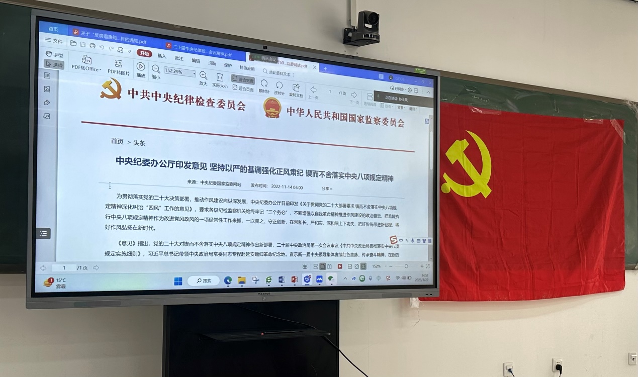 计算科学系师生联合党支部全体学生党员组织进行了“反腐倡廉每季一课”2023 年第一季度的学习,分别针对二十届中央纪律检查委员会第二次全体会议精神、中央纪委办公厅印发《关于贯彻党的二十大部署要求 锲而不舍落实中央八项规定精神深化纠治“四风”工作的意见》、学校2023 年全面从严治党工作会议精神三项重要内容进行学习。支部书记孙玉泉同志强调全体党员在做好本职工作的同时应严守纪律规矩,不断强化自我监督、自我约束,以高度责任感使命感将反腐倡廉的学习内化于心、外化于行,以实际行动体现对党忠诚、听党指挥、为党尽责。