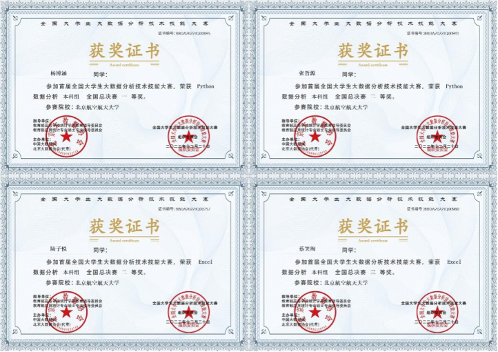 自本届比赛2022年8月启动以来,学院领导高度重视大力支持,统计与运筹系罗雪老师、刘超老师积极组织动员,我校共有24人次参加本次大赛,其中新葡萄8883官网amg官网20人,机械工程及自动化学院4人。通过刘超老师、戴蔚老师等的悉心指导,在省级赛中,24名参赛同学在万余名选手中脱颖而出,获得北京赛区一等奖4项、二等奖4项、三等奖6项等14项奖励。其中,我院本科生杨博涵、张哲源、蔡笑绚以及机械工程及自动化学院陆子悦等4名一等奖获得者晋级全国总决赛,经过激烈角逐,最终获得全国一等奖1项、全国二等奖2项和全国三等奖1项的优异成绩,同时获得北京大数据协会《初级数据分析师》证书。与此同时,刘超、戴蔚两位老师获得指导教师奖。