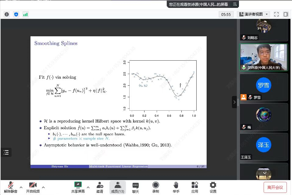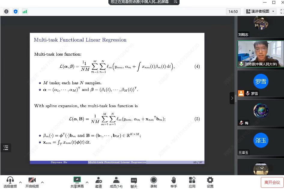 2022年11月18日,中国人民大学统计与大数据研究院贺诗源老师应罗雪老师的邀请,通过线上的方式为新葡萄8883官网amg官网师生带来了一场题为“A Unified Analysis of Multi-task Functional Linear Regression Models with Manifold Constraint and Composite Quadratic Penalty”的学术报告。