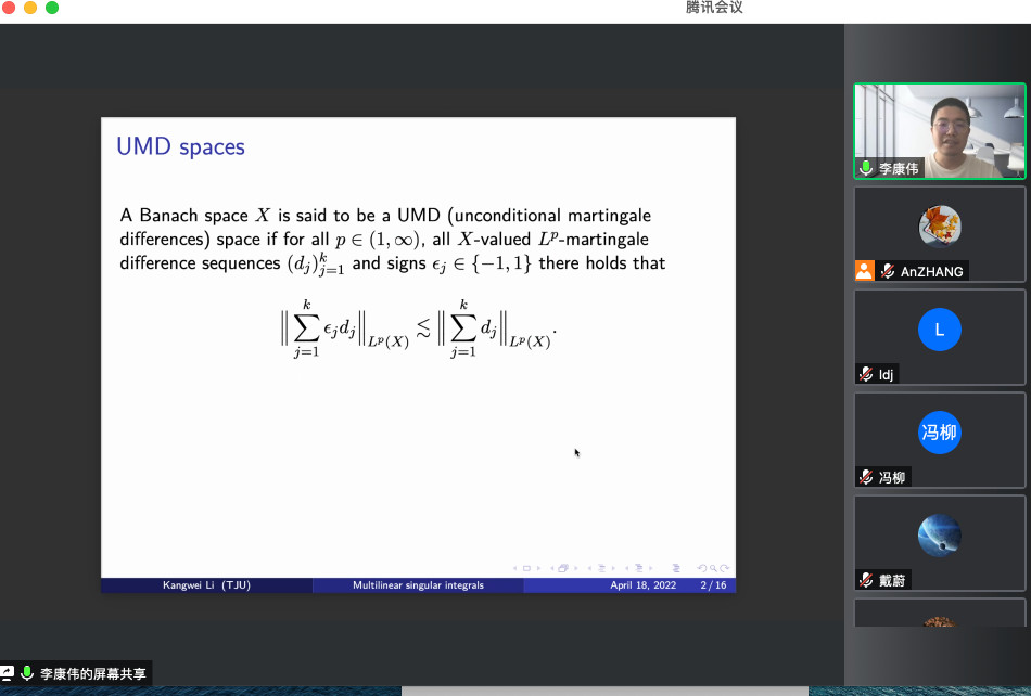 2022年04月18日,天津大学李康伟教授,应邀为新葡萄8883官网amg官网师生做了题为 “UMD-valued extension of multilinear singular integrals”的学术报告,报告由张安老师主持。