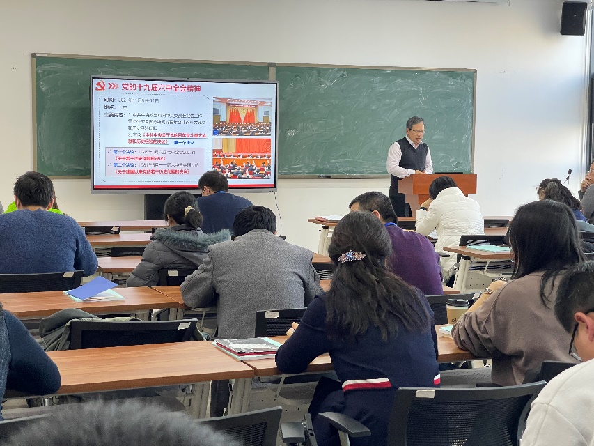 为深入学习贯彻党的十九届六中全会精神,2021年12月29日,新葡萄8883官网amg官网在沙河校区E404召开全体教职工大会,全院80余名教职工参加会议,韩德仁院长做党的十九届六中全会精神宣讲,会议由党委书记袁星主持。