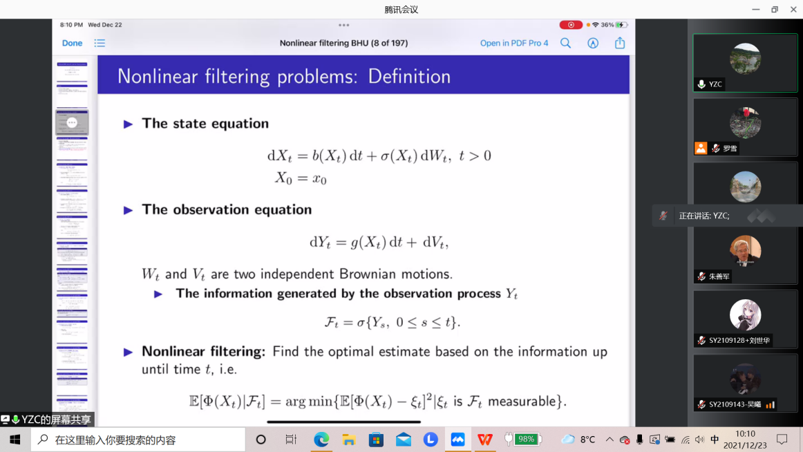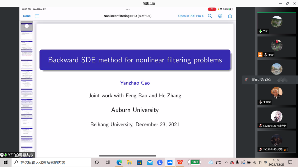 2021年12月23日,美国奥本大学数学与统计学系曹延昭教授应罗雪老师的邀请,通过线上的方式在北航数学论坛为数学学院的师生带来了一场题为“Backward stochastic differential equation method for nonlinear filtering problems”的学术报告。