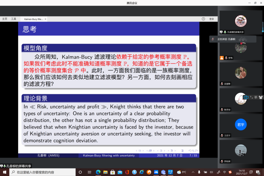 2021年12月7日,中国科学院数学与系统科学研究院系统所博士后孔垂柳博士应罗雪老师的邀请,通过线上的方式为统计与运筹系师生做了一场主题为“Kalman-Bucy filtering and minimum mean square estimator under uncertainty”的学术报告。