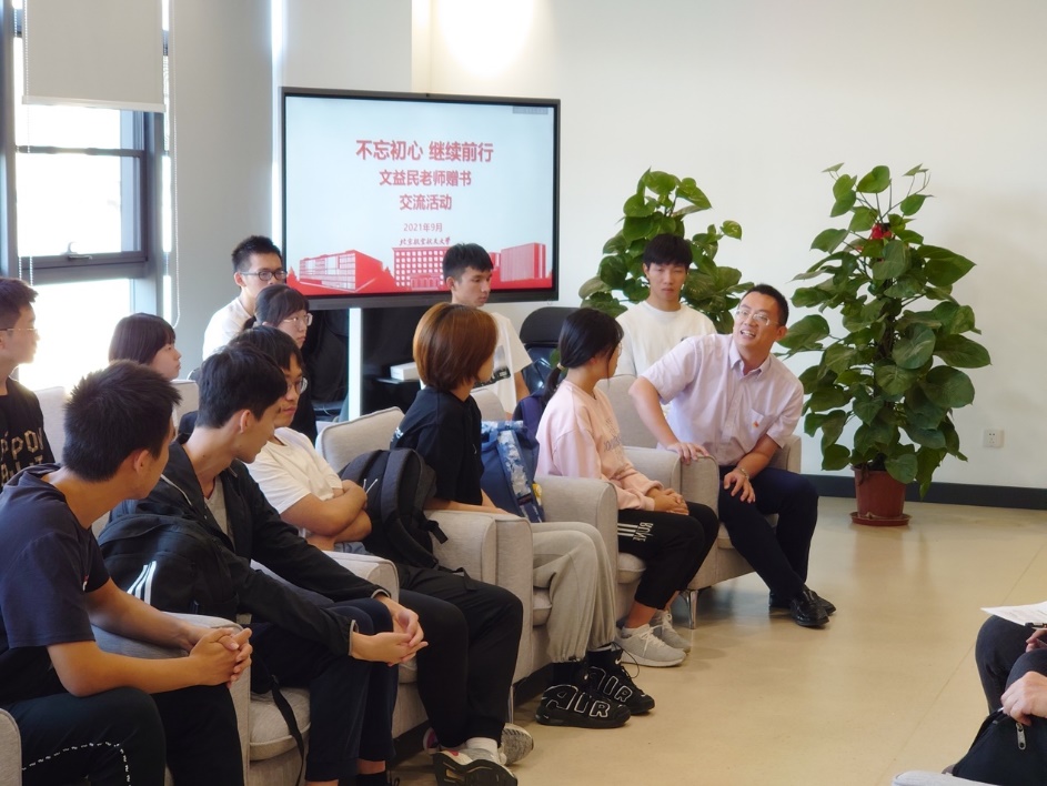 9月22日,原北航第一基础课部高等数学教研室离休教师文益民老先生与学院师生开展“不忘初心,继续前进”主题交流座谈会,文老师在座谈会上讲述了自己参加革命、坚守教研岗位、一心向党的故事,并向与会学生代表赠予了自己的文集《不忘初心 继续前进》,以此勉励同学们爱党爱国,传承革命精神,做空天报国的北航人。数学学院党委书记袁星老师和学院本科生代表25人参加了此次活动,活动由学院党委副书记曾煜老师主持。