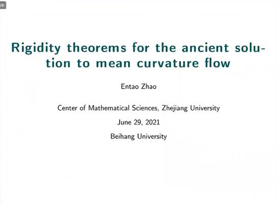 2021年6月29日上午,浙江大学赵恩涛副教授应胡鹰翔老师的邀请,为新葡萄8883官网amg官网师生带来了一场题为 “Rigidity theorems for the ancient solution to mean curvature flow” 的学术报告。报告由胡鹰翔老师主持。