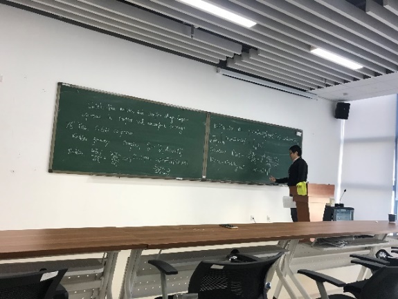 研讨会上,六位不同研究方向的青年学者分别介绍了各自在相关领域的最新研究进展。荆文甲介绍了齐次化方法在多孔区域上的Lame系统的Dirichlet问题中的应用;刘保平介绍了多层KdV方程在低正则性下的整体存在性的求解方法;沈良明介绍了Calabi猜想以及他在Tian-Yau问题上的最新研究进展;金龙介绍了负曲率曲面上特征值问题的控制,并介绍了微局部分析、调和分析等工具在该问题中的应用;郑孝信介绍了Navier-Stokes 方程整体弱解的存在性及正则性问题;杨诗武介绍了半线性波方程的近似衰减估计。