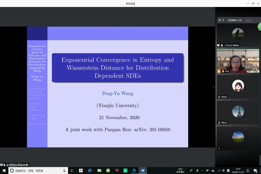 2020年11月27日上午,国家杰出基金获得者、长江特聘教授王凤雨教授受邀为新葡萄8883官网amg官网师生带来了一场题为:“Exponential Convergence in Entropy and Wasserstein Distance for Distribution Dependent SDEs ”的学术报告。报告由新葡萄8883官网amg官网统计与运筹系系主任罗雪副教授主持。