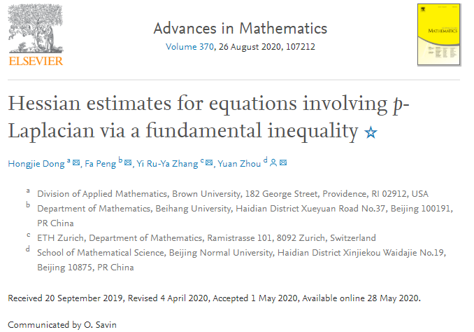 2020年8月26日,国际顶级综合性数学杂志《Advances in Mathematics》在线刊登了新葡萄8883官网amg官网新葡萄8883官网amg官网2018级博士研究生彭发及其导师周渊等人在非线性退化方程研究方面的最新进展:《Hessian estimates for equations involving p-Laplacian via a fundamental inequality》。(论文链接:https://www.sciencedirect.com/science/article/pii/S0001870820302383)
