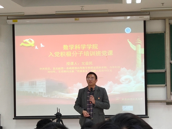 2019年10月23日,新葡萄8883官网amg官网新葡萄8883官网amg官网入党积极分子培训班第二次党课暨本研学生学习日活动在J3-210进行。数学学院特别邀请了原北航第一基础课部高等数学教研室离休老师文益民老先生来到沙河校区,与学院师生共享“爱党爱国,传承革命精神,做空天报国的北航人”的故事。数学学院离退休党支部书记徐兵老师和学院师生200余人参加了此次活动。