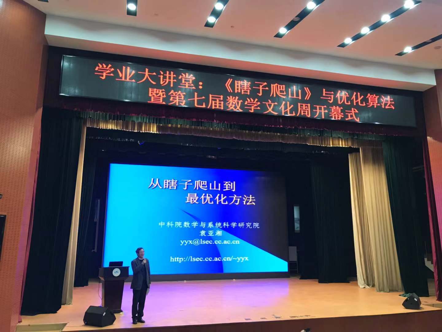 11.4日下午两点,咏曼剧场济济一堂、座无虚席,一年一度的北航数学文化周与莘莘学子又一次相约在收获的深秋季节。应广大同学对学习数学的需求与期待,第七届北航数学文化周特别邀请了中国科学院院士、巴西科学院外籍院士、发展中国家科学院院士袁亚湘老师来到北航沙河校区,和北航学生特别是一、二年级本科生聊聊学习数学的趣味和魅力。