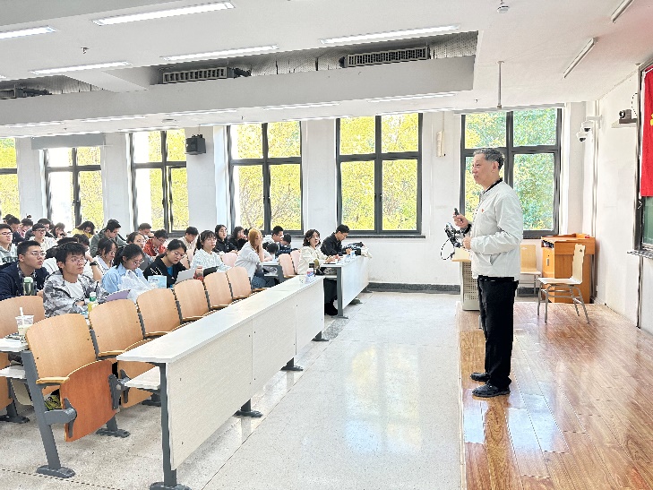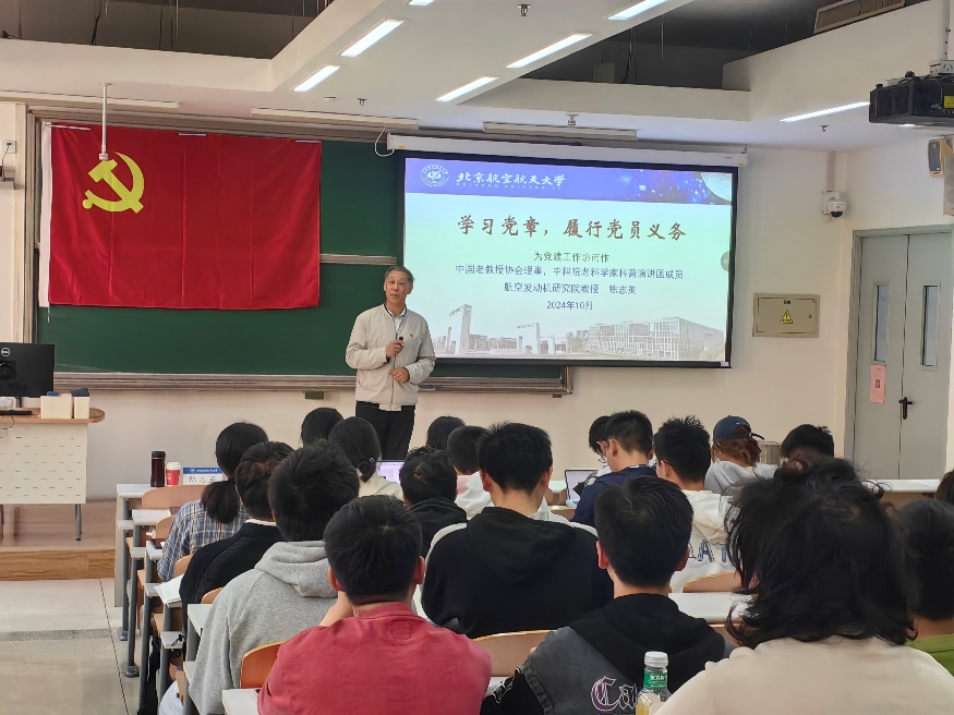 10月23日下午,新葡萄8883官网amg官网2024年秋季学期院党校第一次党课暨开班仪式于沙河校区j5-201举行。本次党课由北航“三老”协会常务副会长、航空发动机研究院陈志英教授主讲。学院党委副书记魏茜出席,近150名学生党员和入党积极分子聆听学习。