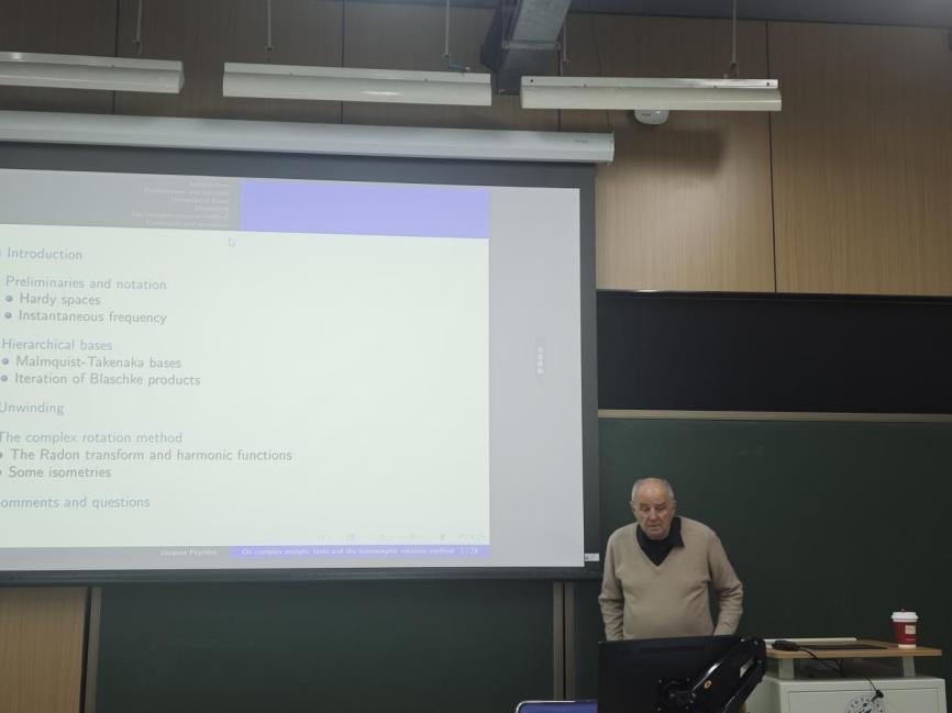 在本次报告中,Jacques Peyrière教授首先介绍了Hardy空间、瞬时频率等基本概念,以及Hardy空间中全纯函数的多尺度标准正交基的相关知识。随后,Jacques Peyrière教授利用扩展的全纯Radon变换将适用于一维的非线性全纯分析方法推广到了高维情况。最后,Jacques Peyrière教授为我们介绍了使用全纯性质的非线性逼近的最新进展的综述,并讨论了他们在Radon变换下到高维的扩展。报告结束后,Jacques Peyrière教授与与会师生就更多有趣的问题进行了细致的探讨